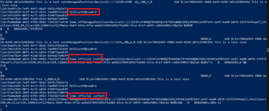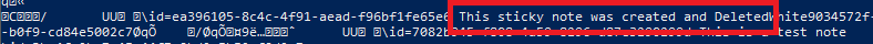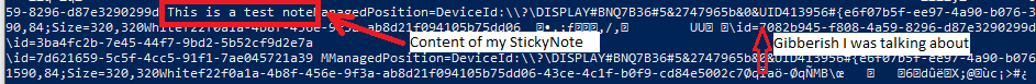 - The content of a Sticky Note is in clear text but in between gibberish when the file is read directly on PowerShell (you’ll see that in a bit.)
