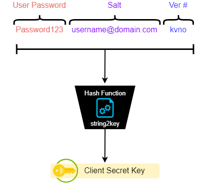 Next, the user decrypts the first message, by using his domain credentials, however this looks a little different under the hood; The password is used to generate the client secret key which unlocks the details for the user. The client secret key is generated as follows: