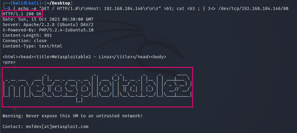 The /dev/tcp file path is used for TCP connections. It allows you to establish a connection to a remote server and interact with it over the TCP/IP protocol. Here’s a basic example tried against metasploitable (in a one-liner);